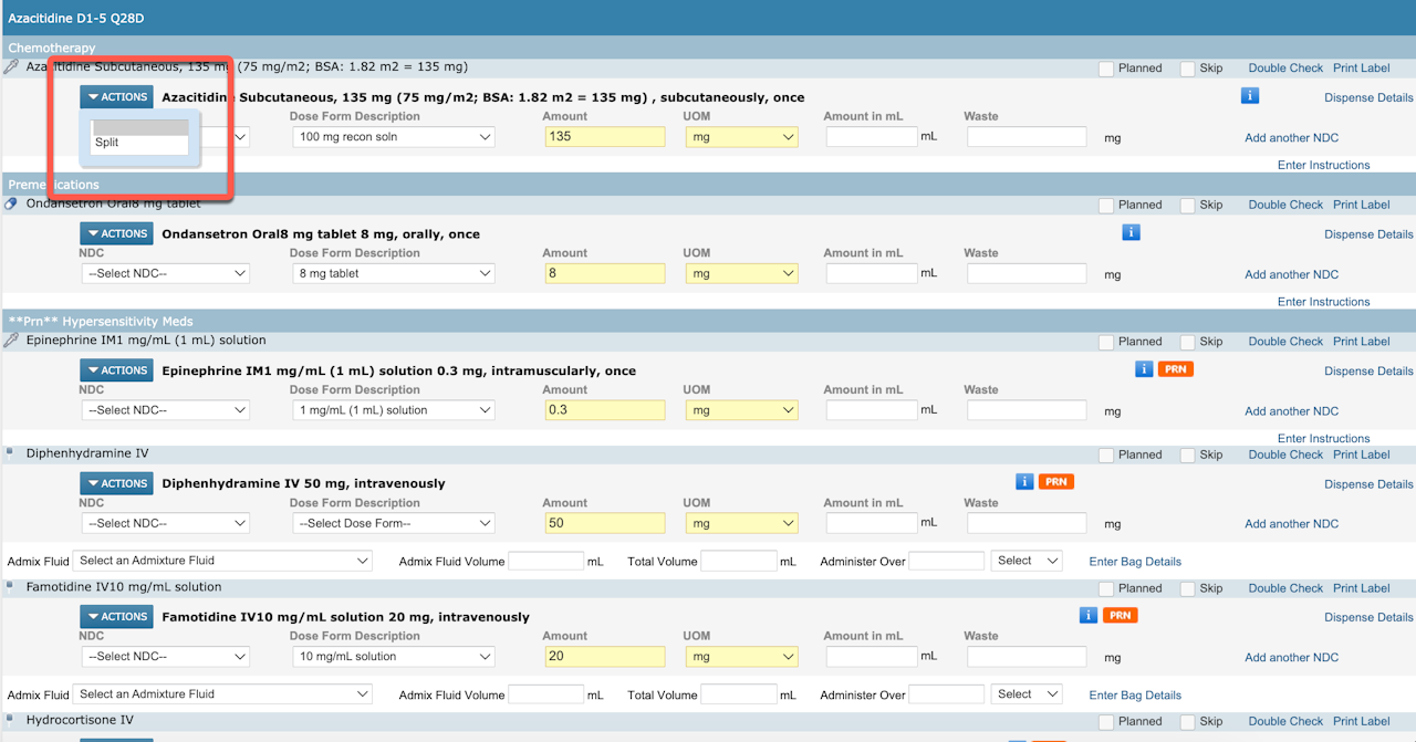 Click the ACTIONS button next to the medication dose and select Split from the drop-down menu. The dose will split into two separate lines.