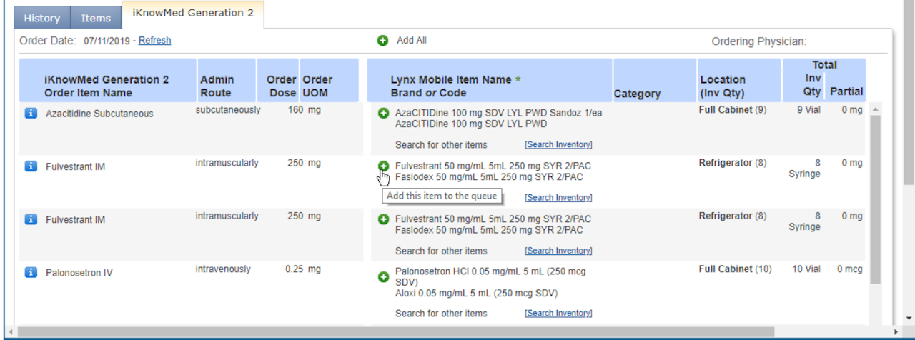 In Lynx on the Dispense-Add Items page for the patient, click the green plus to the right of each order line to add the dose to the dispense.