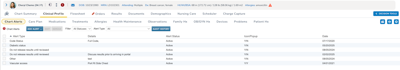 The Patient Alerts Chart Summary Widget provides a details list of alerts for a single patient.