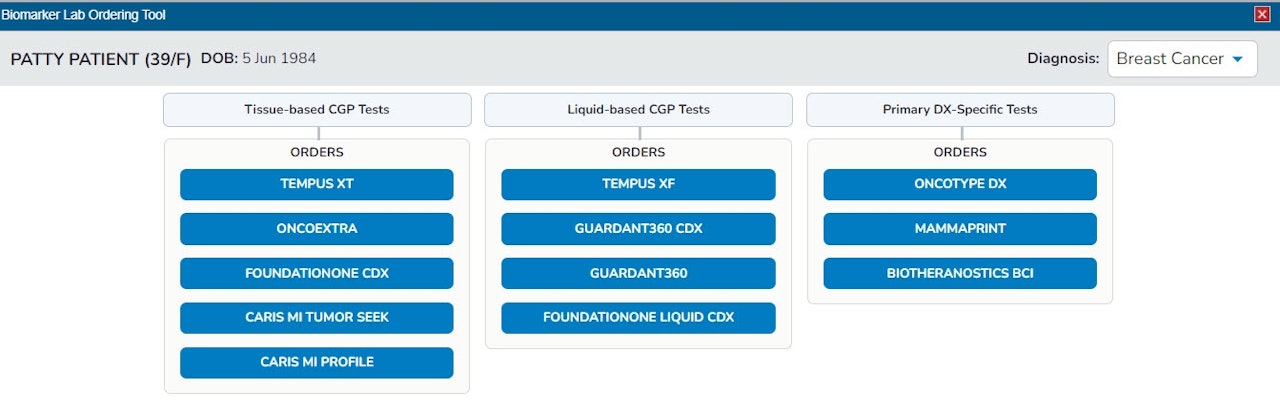 The Precision Medicine Biomarker Lab Ordering Tool is a guide to ordering the labs and tests that are specific to your patient's diagnosis. It generates a requisition form with your patient's info and lists tests to be performed. Just check off the tests you want performed, sign the requisition, and fax it to your Pathology/Group or hand it to your lab.