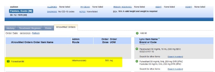 In the "iKnowMed Generation 2 Orders" tab of Lynx Dispense, staff will check that the item matches the correct item.