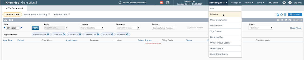 The Imaging Worklist Queue serves as a centralized list of imaging tasks. Use the Imaging Worklist Queue to process reports and images.
