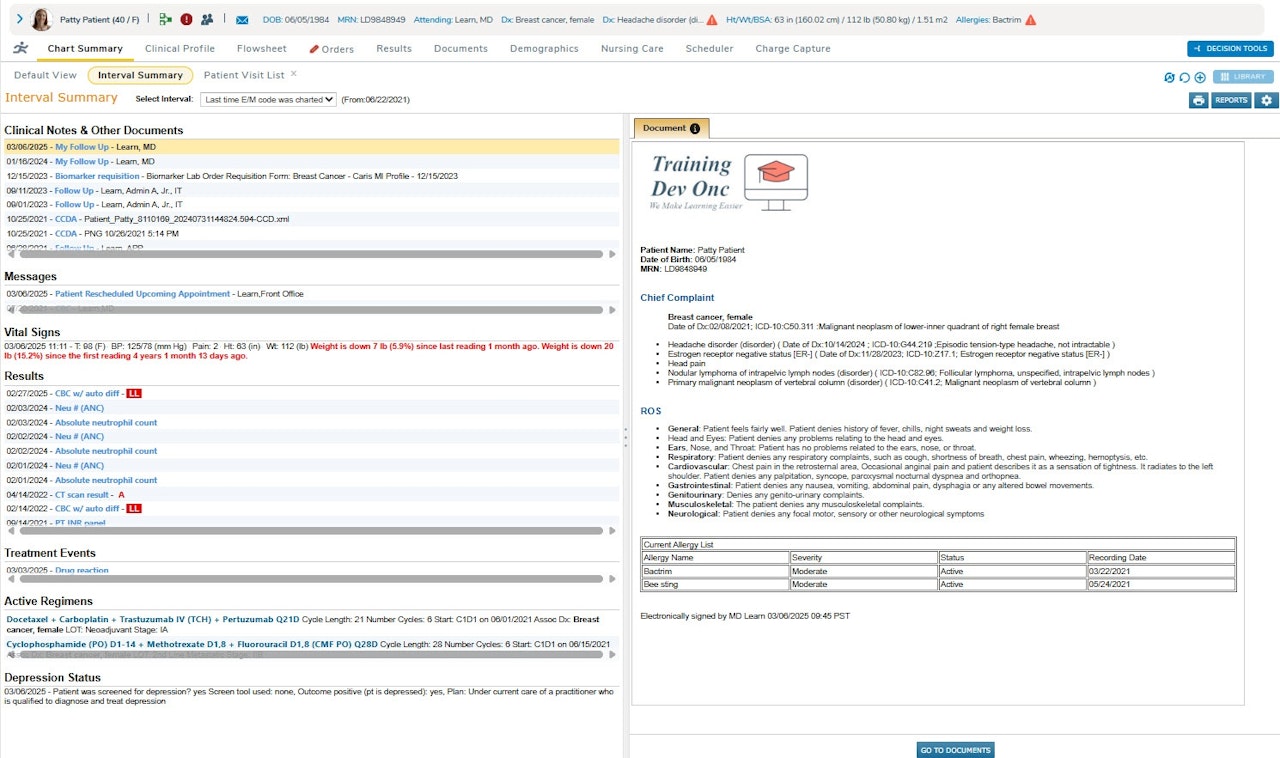 Use the Interval Summary to view charted information for specific time periods. This summary organizes patient information into the following sections: