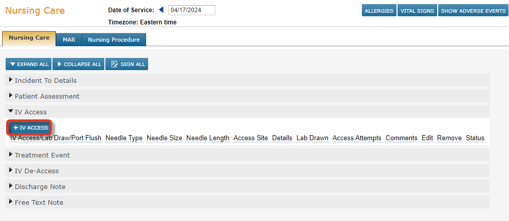 When documenting an IV infusion, always capture the IV information in the IV Access section under Nursing Care in the patient chart.