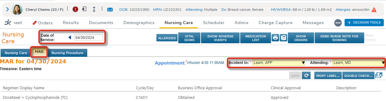 The Date of Service and Timezone will display at the top. Before charting drug administrations set the Incident to and Attending providers.