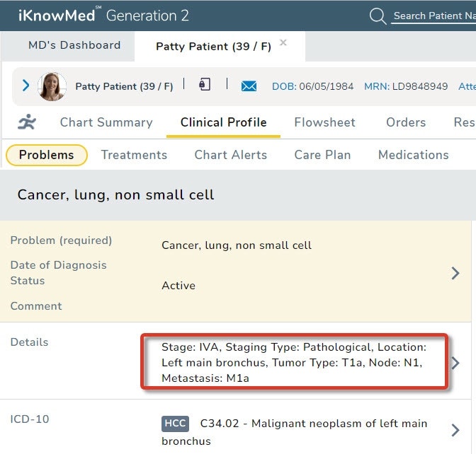When the following diagnoses are selected and saved as a patient's Problem, Recommended Biomarker Testing options display based on NCCN guidelines:
