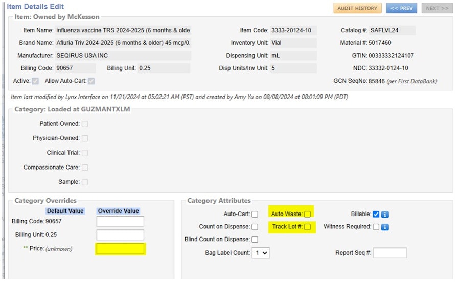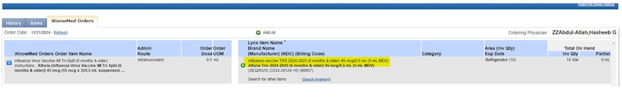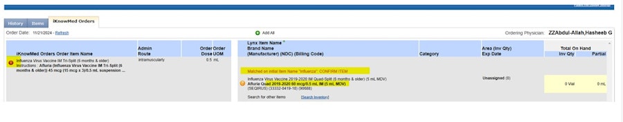 Answer: If you receive an alert from Lynx notifying you that there is a mismatch on the vaccine, such as with the Item 1st Name “Influenza,” please follow these steps: